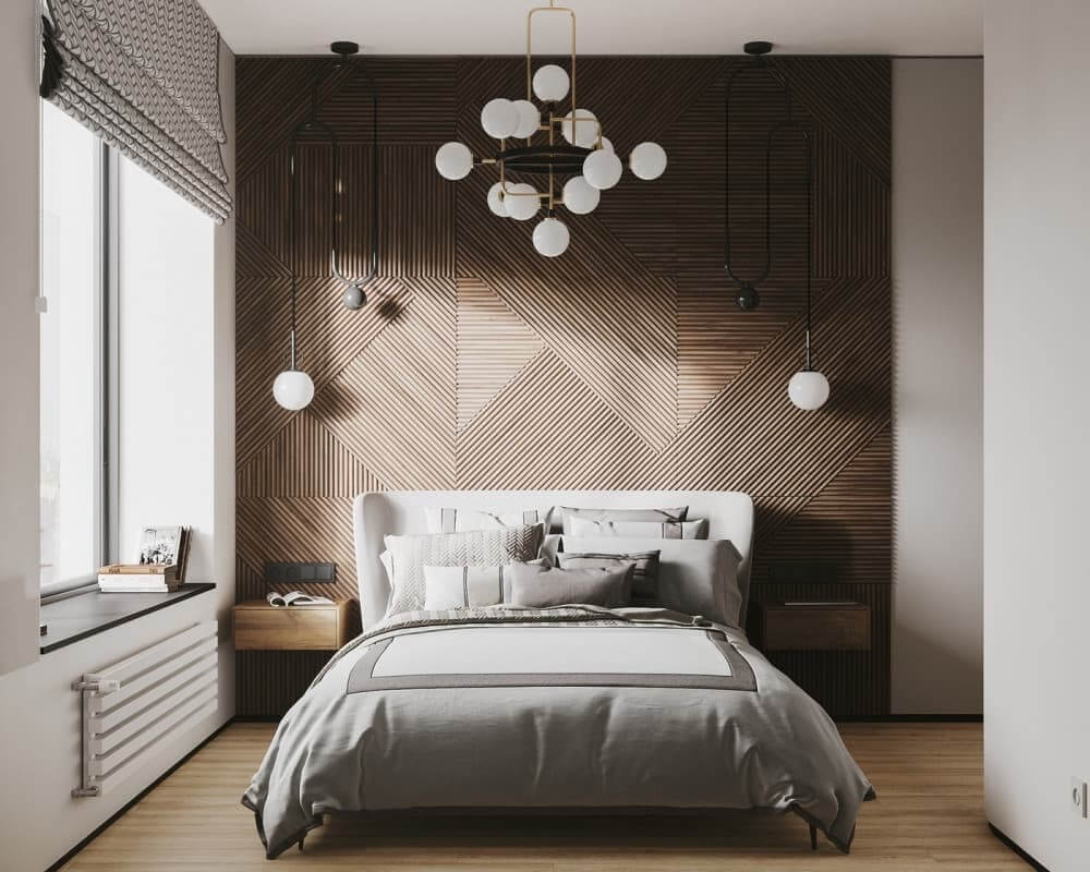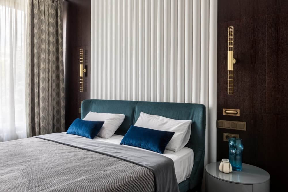 Дизайнер интерьера Надежда Лашку советует для спальни в современном стиле модели кровати с широким изголовьем и закруглёнными «ушками», которые будут создавать дополнительный уют и камерность. Проект квартиры в современном стиле «Береговой»