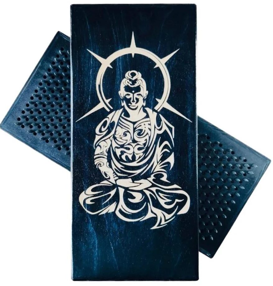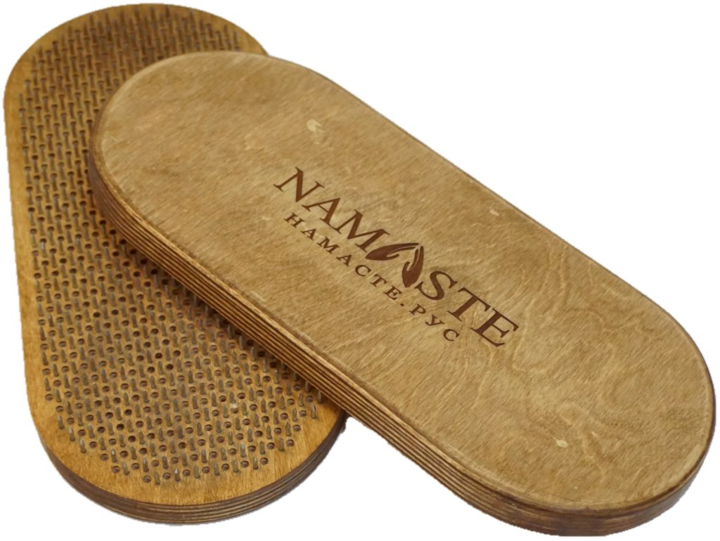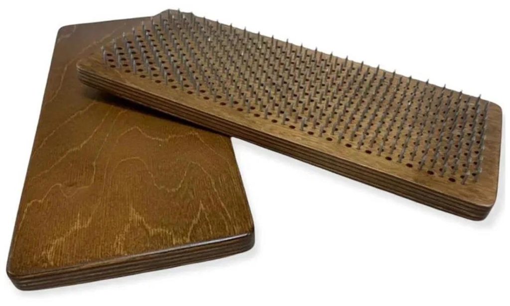 Эта доска для йоги также состоит из двух половинок прямоугольной формы. Цвет — черный. Размеры у нее следующие: длина — 32 см., ширина 13 см. Вес изделия составляет 1.3 кг. По длине она подойдет даже для 48 размера ноги. Основа изготовлена из дерева и покрыта специальным яхтенным маслом, которое сохраняет приятный запах, идущий от дерева. Гвозди оцинкованные, жестко закреплены на поверхности. Шаг равен 8 мм. В комплекте идет мешочек для хранения. Гравировка выполнена лазером, поэтому рисунок не сотрется долгое время.