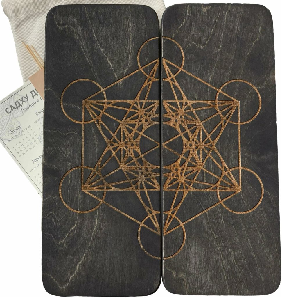 Это изделие состоит из двух прямоугольных частей. Для каждой ноги отдельная половинка. Цвет — черный. Сверху она покрыта лаком. Материал, используемый для изготовления — дерево. Гвозди имеют в составе цинк. В длину Садху равна 31 см., в ширину — 14 см. Отлично подойдет для любого размера ноги, даже для самого большого. Вес всего изделия составляет около 2 кг. Гвозди динамичные, то есть подстраиваются под изгиб ступней, чтобы в большей степени охватывать ногу. Они могут сдвигаться на 4 мм. Расстояние между ними — 10 мм. Располагаются они по цветку жизни. И это как раз подойдет для начинающих практику на гвоздях. На лицевой стороне нанесен рисунок лазером.