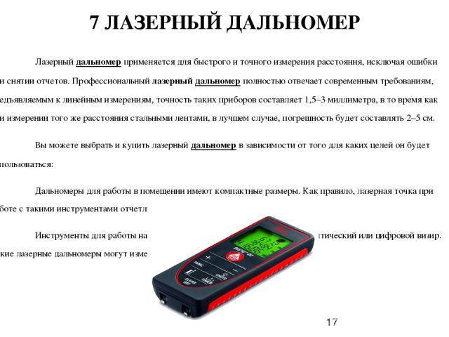 - Лазерные или дальномеры — это современная рулетка, в которой отсутствует лента. Ее роль играет луч лазера, посредством которого осуществляется измерение расстояния до объекта. Такие приборы стоят дороже электронных, и позволяют осуществлять измерения расстояний до 100 метров. Имеют разные классы точности, и чем длиннее расстояние между измеряемыми объектами, тем ниже точность показаний