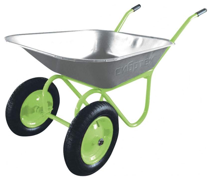 Садовая тачка с двумя колесами, благодаря которым обеспечивается отличный баланс. Грузоподъемность модели составляет 180 кг, при этом ее объем – 110 литров. Это хорошие показатели, при которых Вы сможете задействовать тачку при сложных строительных работах, требующих перевозок большого количества тяжелого груза. Толщина корыта равна 0,7 мм, для строительных моделей это небольшое значение, чем и обусловливается низкая (относительно обычных строительных моделей) цена, ведь данную модель лучше использовать именно в домашних условиях на даче, нежели на производстве. Оба колеса пневматического типа, их диаметр составляет 30 сантиметров.
