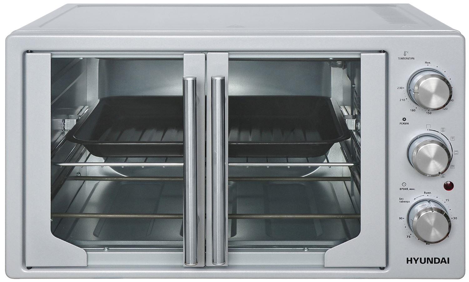 Объём печи составляет 42 литра. Позволяет приготовить пищу на большую семью. Двухстворчатые дверцы обеспечивают удобство при закладывании и вынимания посуды.