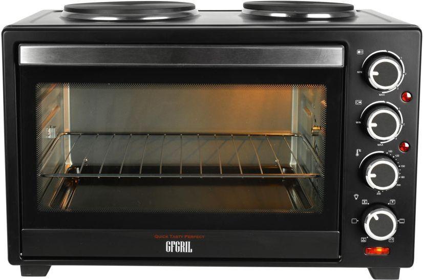 Мини-печь с конвекцией и грилем станет незаменимым помощником для обладателей компактных кухонь. Отличительной особенностью является наличие 2 конфорок на 1000 Вт каждая. Вмонтированы в корпус. На них можно размещать сковороды и кастрюли больших диаметров. Электрический шкаф вместительный, блюда можно устанавливать на 2 уровнях.
