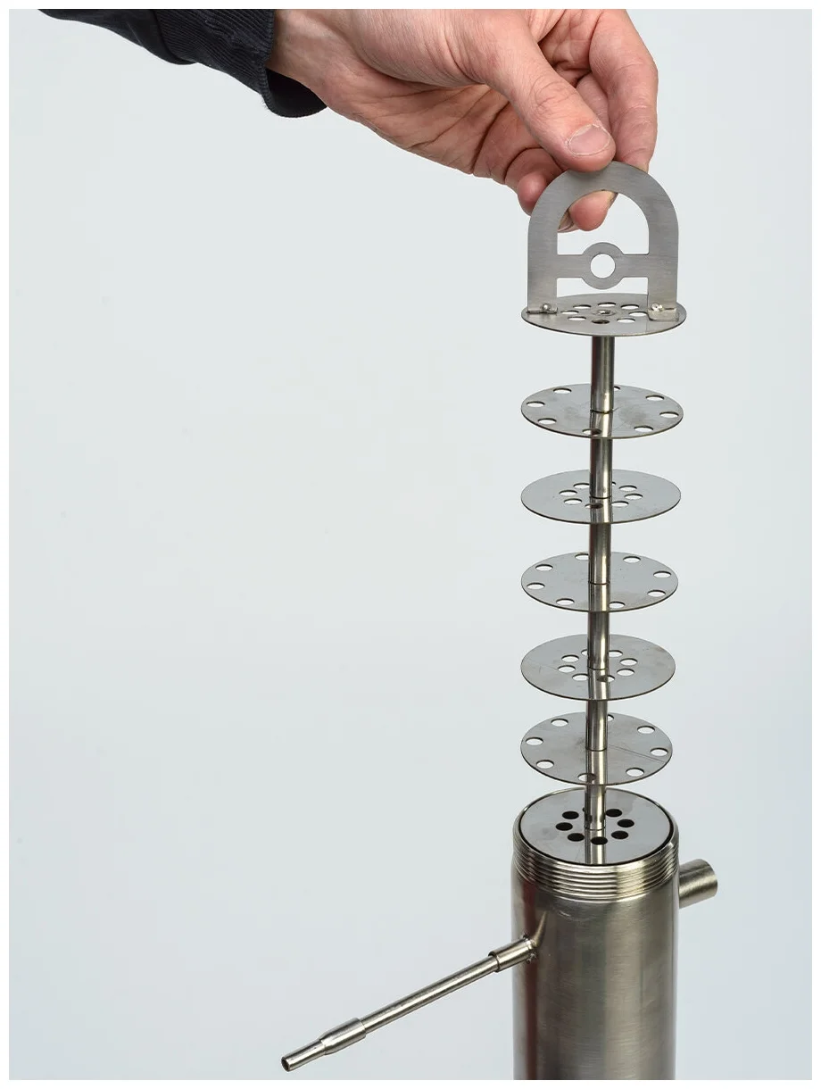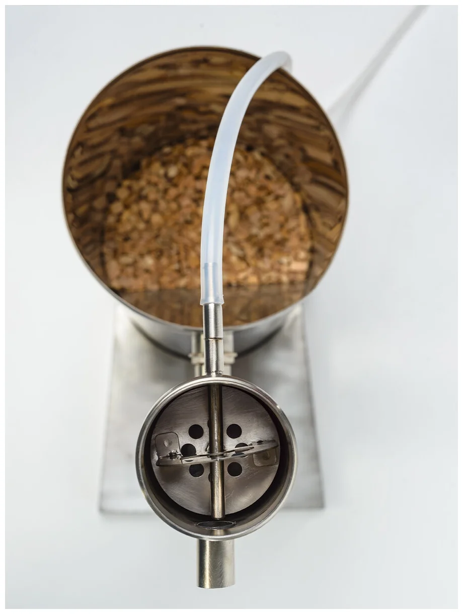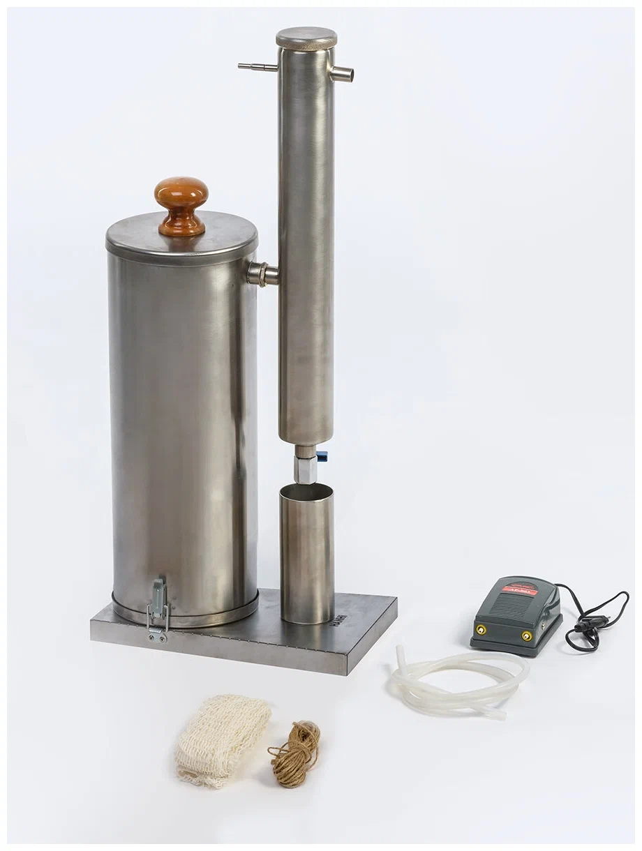 Вертикальная коптилка компактного размера с хорошей загрузкой. Цилиндрическая форма обеспечивает удобное размещение продуктов для обработки. Легкий вес — 3 кг, так что ее удобно переносить и устанавливать где угодно. Прочность стенкам и днищу обеспечивает сталь со специальным порошковым покрытием. Это не просто газовая коптильня горячего копчения, это универсальный аппарат со съемным ТЭНом на 220 Вт. Его легко подключать к розетке, можно ставить на угли, плиту, использовать щепу и открытый огонь. Хороший вместительный бак на 20 литров, в комплект входят три решётки для разноуровневой прожарки и поддон для сбора жира. Ножки у коптильни съёмные, имеется подставка для нагревательного элемента. К сожалению, термометр и дымоотвод отсутствуют. Антикоррозионное покрытие корпуса обеспечит долговечность и прочность коптильни.