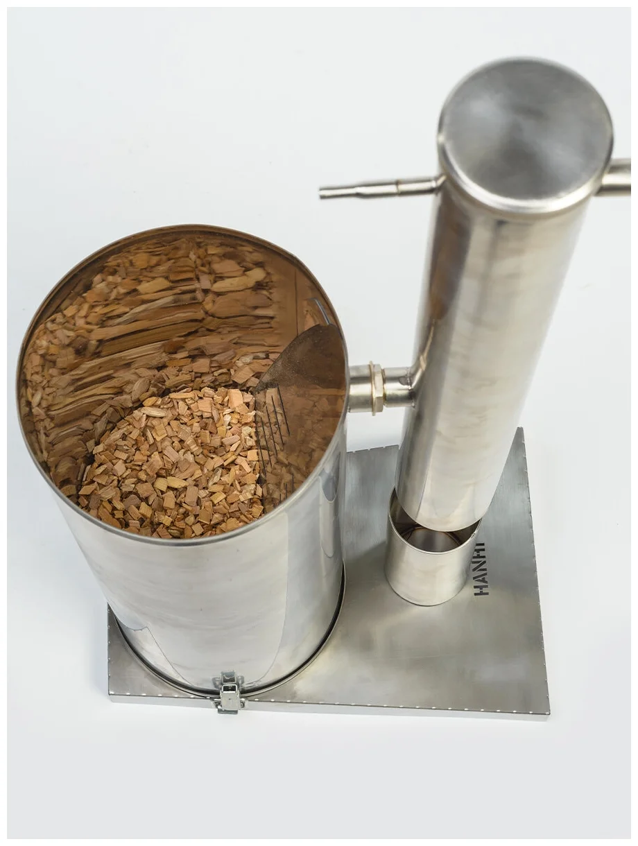 Обработка продуктов осуществляется дымом, температура которого составляет от 19 до 40 градусов. Несмотря на то, что этот параметр не слишком высокий, однако за счет данной технологии удается вывести из рыбы и мяса различные болезнетворные и просто вредные для человеческого организма бактерии и прочие микроорганизмы. Срок хранения пищи, приготовленной таким способом, довольно большой. Нельзя сказать, что устройство получилось довольно тяжелым – дымогенератор весит 1,2 кг, емкость – чуть более 5 кг.