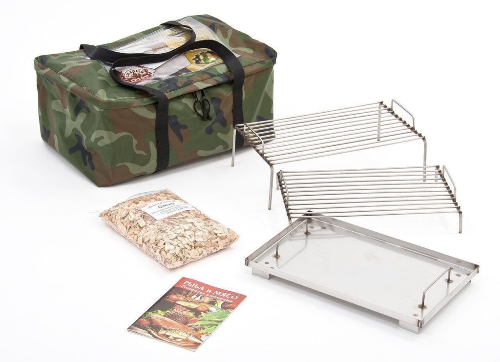 Достаточно вместительное приспособление прямоугольной формы, изготовленное из нержавеющей стали и позволяющее готовить еду для большой компании. Это одна из самых известных качественных моделей, которым чаще всего отдается предпочтение. Представляет собой ящик со специальной крышкой, ручками для переноски, поддоном и решетками, устанавливаемыми на высоту различной степени. Для быстрой переноски оборудования рекомендуется использовать сумку, входящую в комплект. Кроме того, коптилка не имеет ножек и размещается исключительно прямой установкой на открытый огонь, мангал или плиту. Благодаря встроенному гидрозатвору температура дыма своевременно снижается и регулируется. Толщина стенок топки — 2 мм, вес – 20 кг, размеры: 50х30х30 см. Не подходит для холодного копчения продуктов.