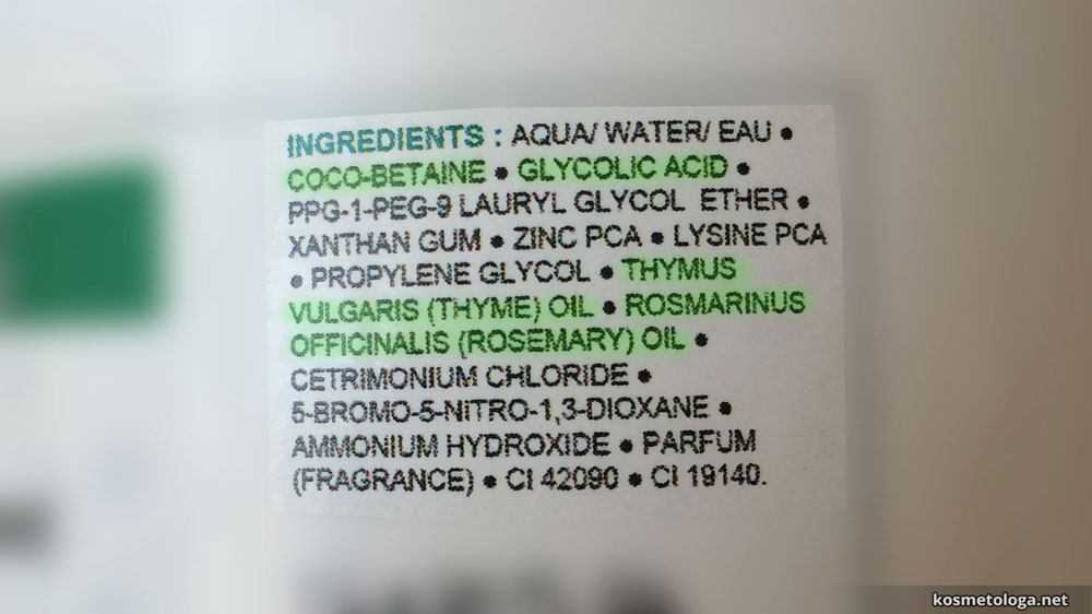В составе средства нет лаурил и лаурет сульфатов, зато присутствуют мягкое очищающее вещество Коко-бетаин (Coco-Betaine), гликолевая кислота для очищения пор и предотвращения появления черных точек и натуральные масла – чабреца и розмарина. Отличный состав.