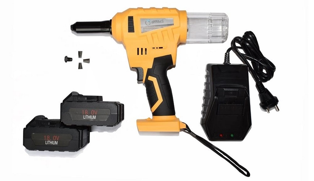Аккумуляторный заклёпочник, обладающий значительной силой втягивания 15 кН. Предназначен для работы с заклёпками диаметром 3,2-6,4 мм. Работает за счёт аккумулятора 18V. Комплектуется двумя батареями, зарядником, монтажным ключом, двумя комплектам губок и насадками. Всё это вместе с электроинструментом размещается в небольшом чемоданчике. Для надёжного захвата на ручке имеются прорезиненные накладки.