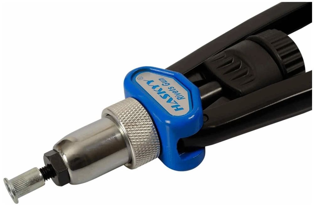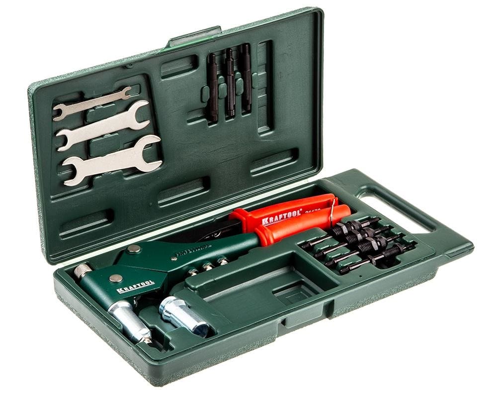 Модель рычажно-складного типа, которая продаётся в удобном кейсе. Хорошо укомплектована. Позволяет надёжно соединять разные детали резьбовыми стальными, алюминиевыми и нержавеющими клёпками. Весит 3,5 кг.