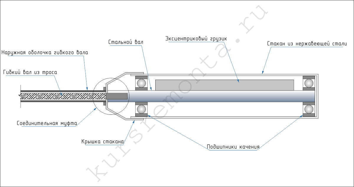 Устройство глубинного вибратора для бетона очень простое. Он работает по принципу эксцентрикового дисбаланса и состоит из трех основных механизмов: