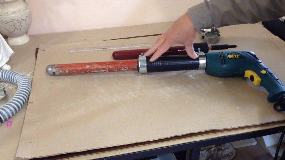 - Изготовление конструкции начинают с центральной детали. Затем совмещают ее с металлической трубкой. Предварительно требуется просверлить насквозь один из концов стержня, чтобы получить отверстие для прикрепления привод к дрели.