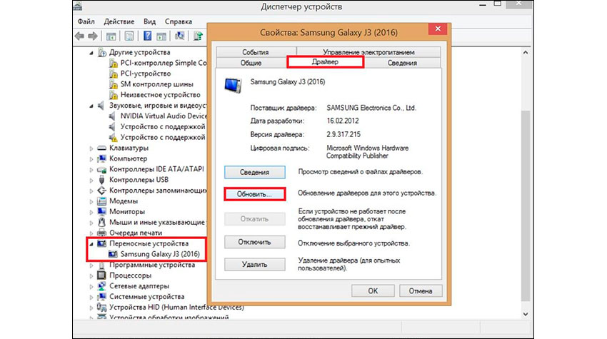 После подключения телефона зайдите в диспетчер устройств ПК и посмотрите, есть ли смартфон в списке переносных устройств. Если есть, но не определяется (или определяется, но без доступа к сохраненным файлам), то причина наверняка в отсутствии установленных драйверов. Для их автоматической установки необходимо переподключить смартфон к USB. Если не помогло, то понадобится нажать ПКМ на обозначение (или название) мобильного телефона в диспетчере устройств, выбрать команду «Обновить драйверы», а затем указать место размещения драйверов или активировать опцию автоматического поиска. Если нужного драйвера не найдется, скачайте его из интернета и повторите процесс обновления.