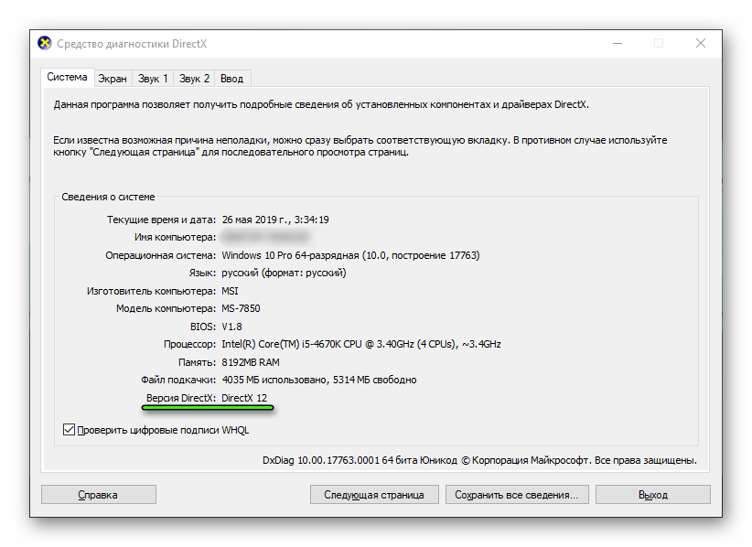 Появится окно с огромным количеством информации. В числе прочего там будет строка «Версия DirectX».