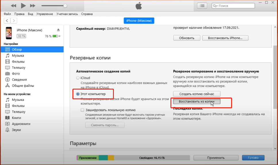 Восстановить информацию также можно при помощи резервной копии, сохраненной в облаке Айтюнс. Подобная процедура требует наличия ПК с соответствующей программой.