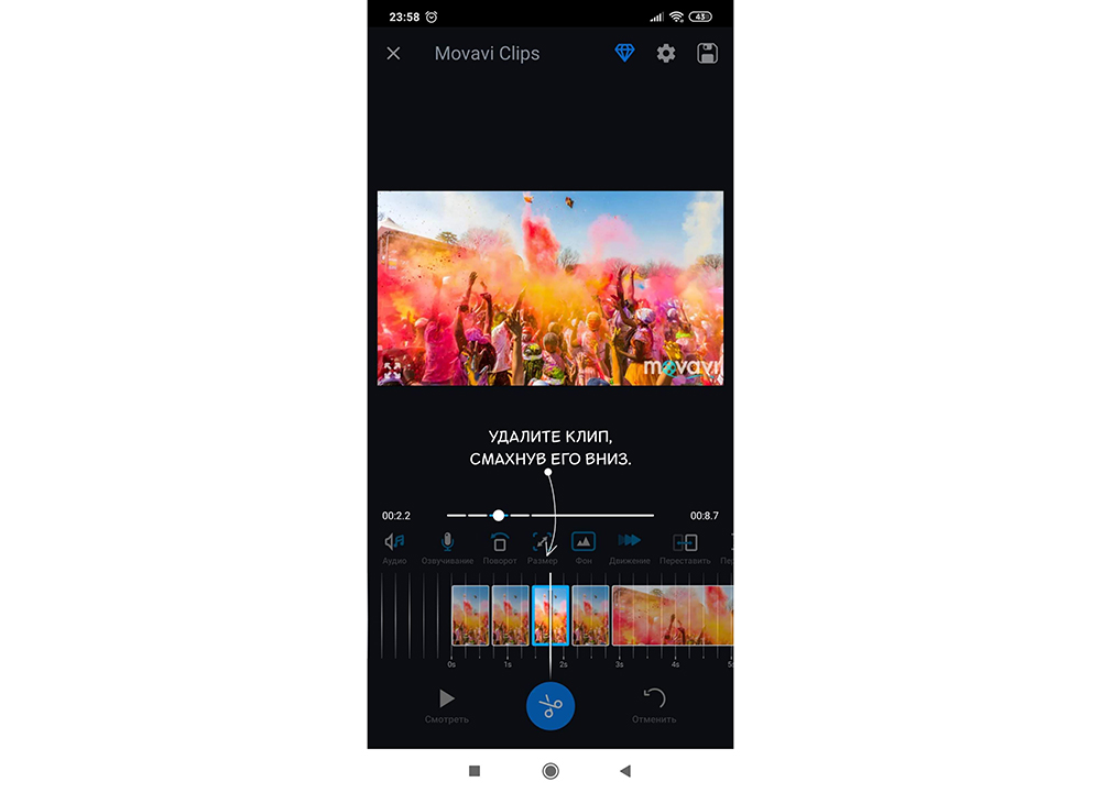Топ самых популярных программ для монтажа видео на Android возглавляет Movavi Clips. Очевидный плюс приложения, который пользователь оценит сразу после скачивания – отсутствие необходимости в регистрации, пользоваться утилитой утилитой можно сразу после просмотра небольшой инструкции.
