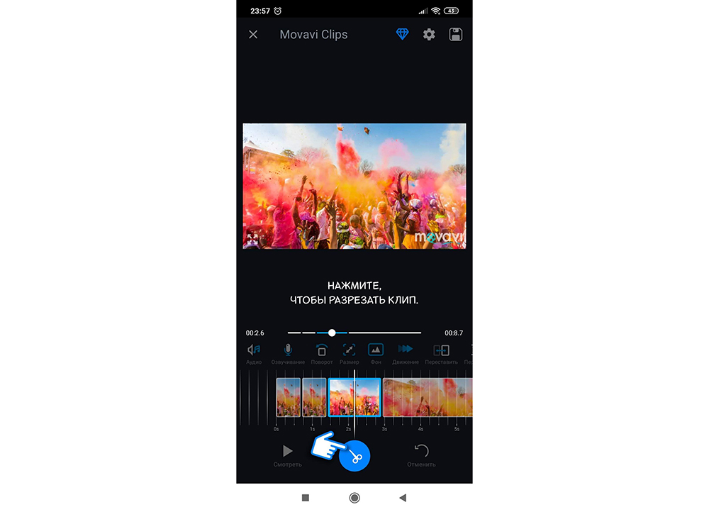 Если потребуется разрезать видеоклип, необходимо кликнуть на ножницы посредине экрана внизу.