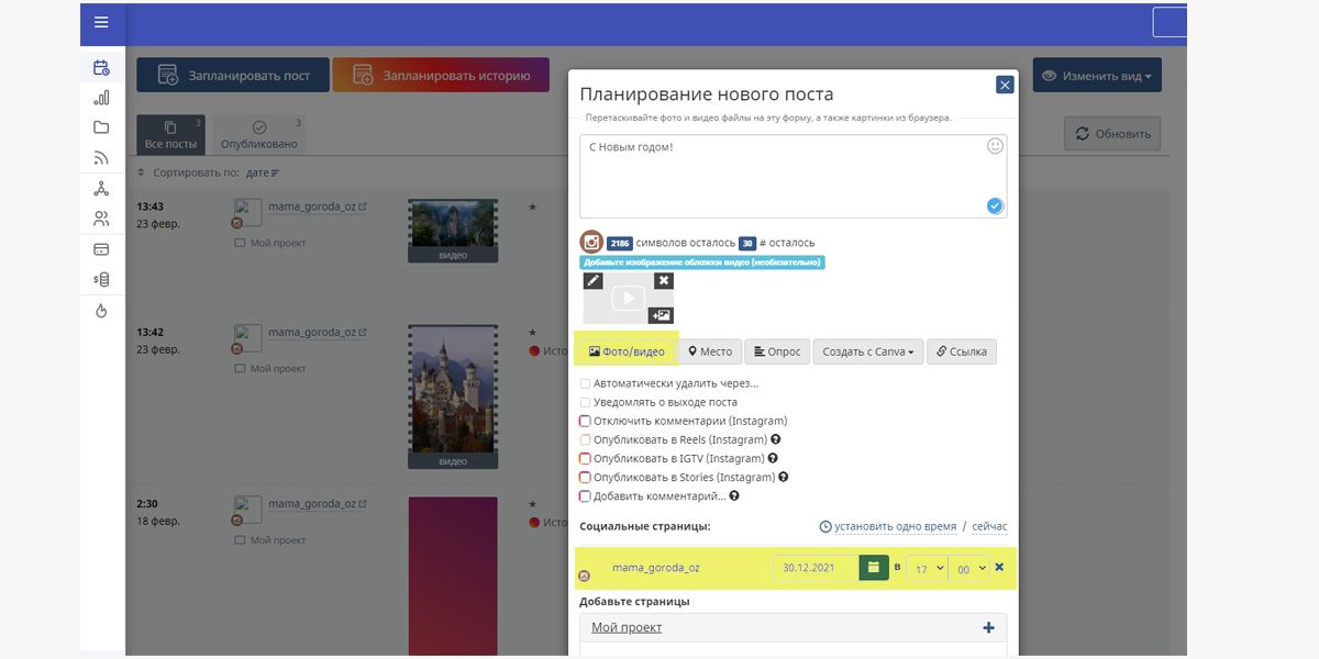 Если выкладываете ролики в соцсети, например, в Инстаграм*, необязательно копировать их на телефон. Используйте сервис отложенного постинга SMMplanner.