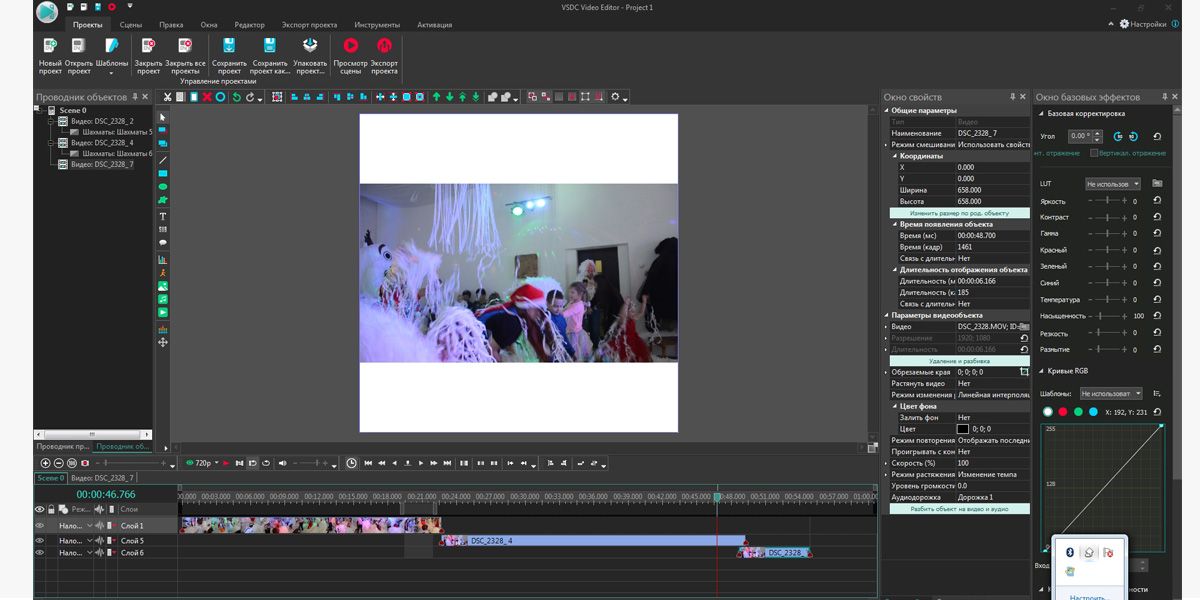 Редактор имеет широкий набор современных эффектов, фильтров и переходов. Вы сможете использовать инструменты для приближения объектов на видео, редактирования роликов, снятых в формате 360, цветокоррекция, анимированные графики и многое другое.
