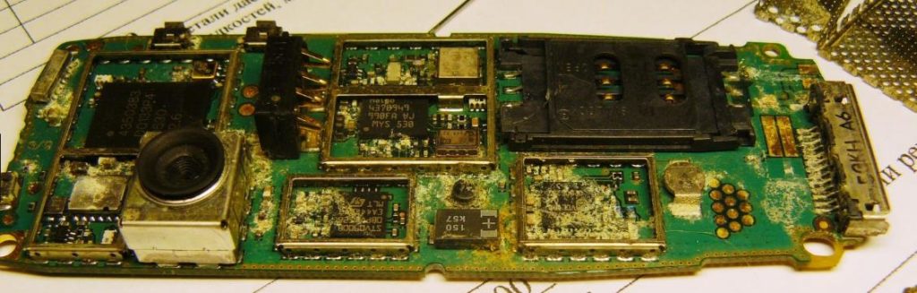 Выход из строя из-за окисления контактов телефона. Такой смартфон становится неремонтопригодным. Бывает, что окисление слабое и в таком случае гаджету ещё реально помочь. Обычно окисленные устройства не подлежат восстановлению.