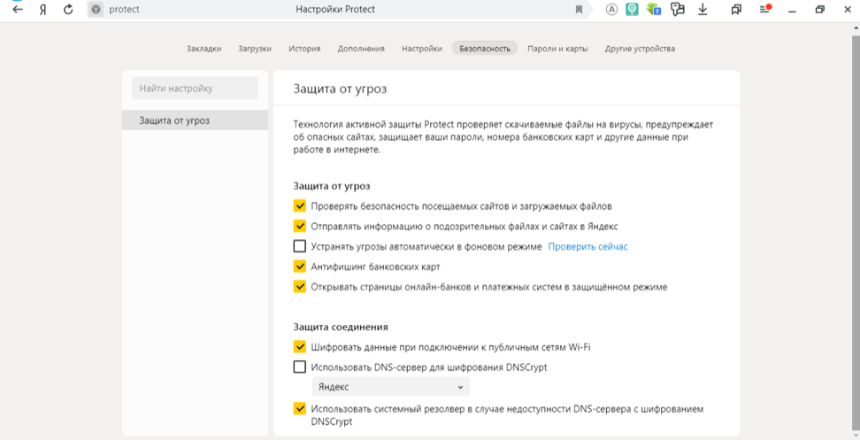Яндекс.Браузер заботится о безопасности пользователей, и именно поэтому помимо всесторонней защиты от навязчивой рекламы и всплывающих окон он использует технологию Yandex Protect Service. Это система активной защиты, которая автоматически мониторит открываемые окна и скачиваемые файлы на предмет потенциальной угрозы. Данная технология не позволяет украсть личные данные пользователя и внести изменения в работу операционной системы, фактически она справляется с функциями полноценного антивируса, особенно, если совместно с ней работают и другие плагины безопасности от разработчика.