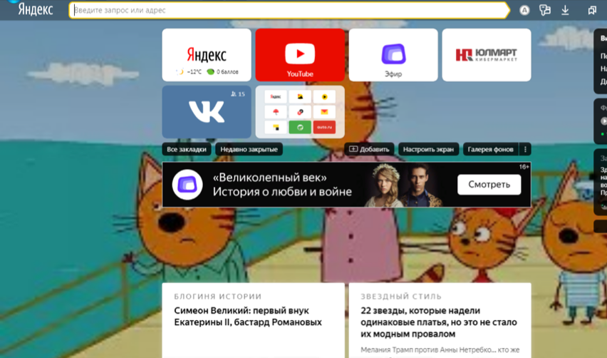 Яндекс Браузер в той же степени, что и Хром, заточен на использование аккаунта и синхронизации всего и вся. Тут куча сервисов. К примеру, по умолчанию на стартовой странице грузится лента «Дзен», а справа висят виджеты вроде «Прямого эфира». Слева есть панель, в которой можно получить доступ к 21 сервису компании, не считая Алисы. Здесь есть чем заняться – интерфейс подаёт множество идей о том, чем бы заняться после открытия браузера, стремится развлекать пользователя контентом и различными форматами взаимодействия.