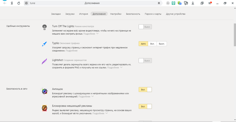 Доступны дополнения для оптимизации работы браузера, которые можно активировать с помощью меню. Самые полезные из них: