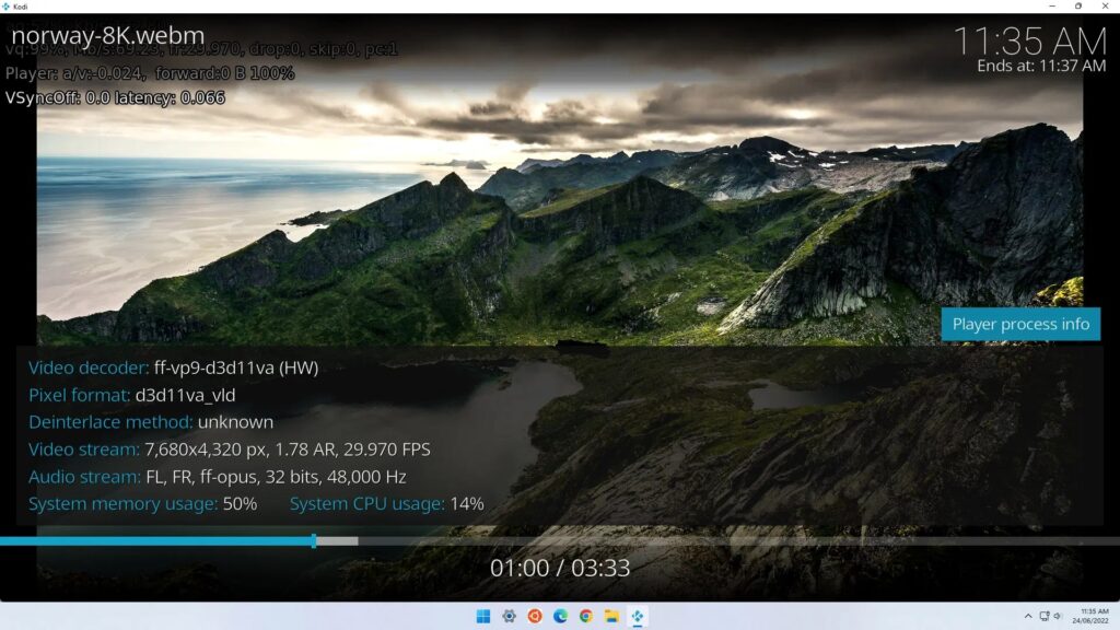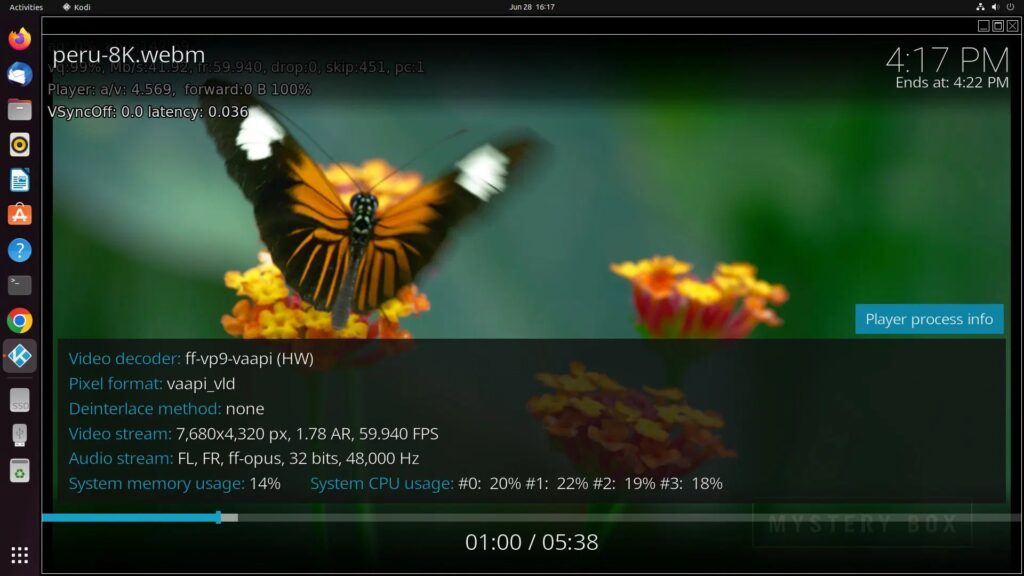 Мы также воспроизвели видео с различным кодированием в Kodi, все из которых без проблем воспроизводились до 8K при 30 кадрах в секунду и использовали аппаратное обеспечение для декодирования: