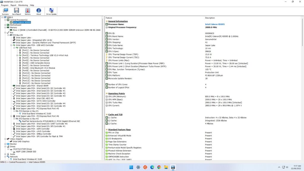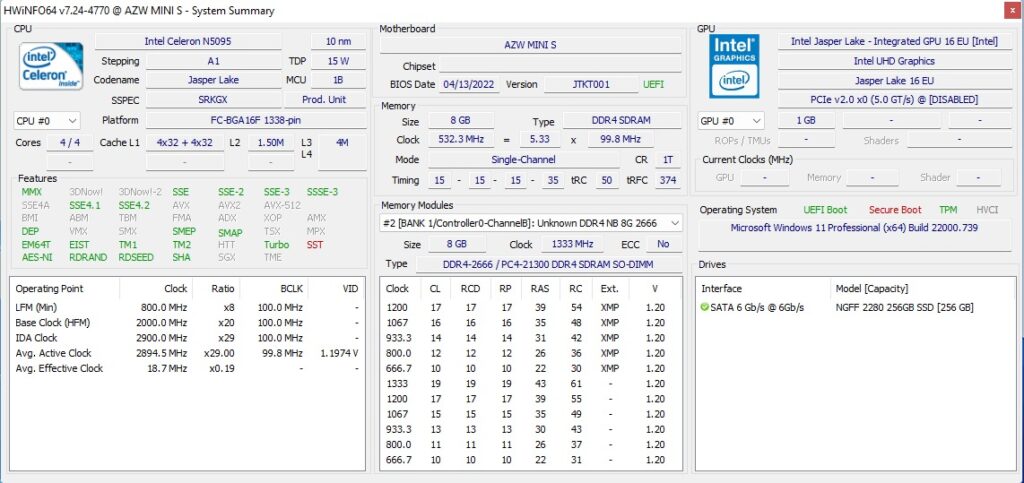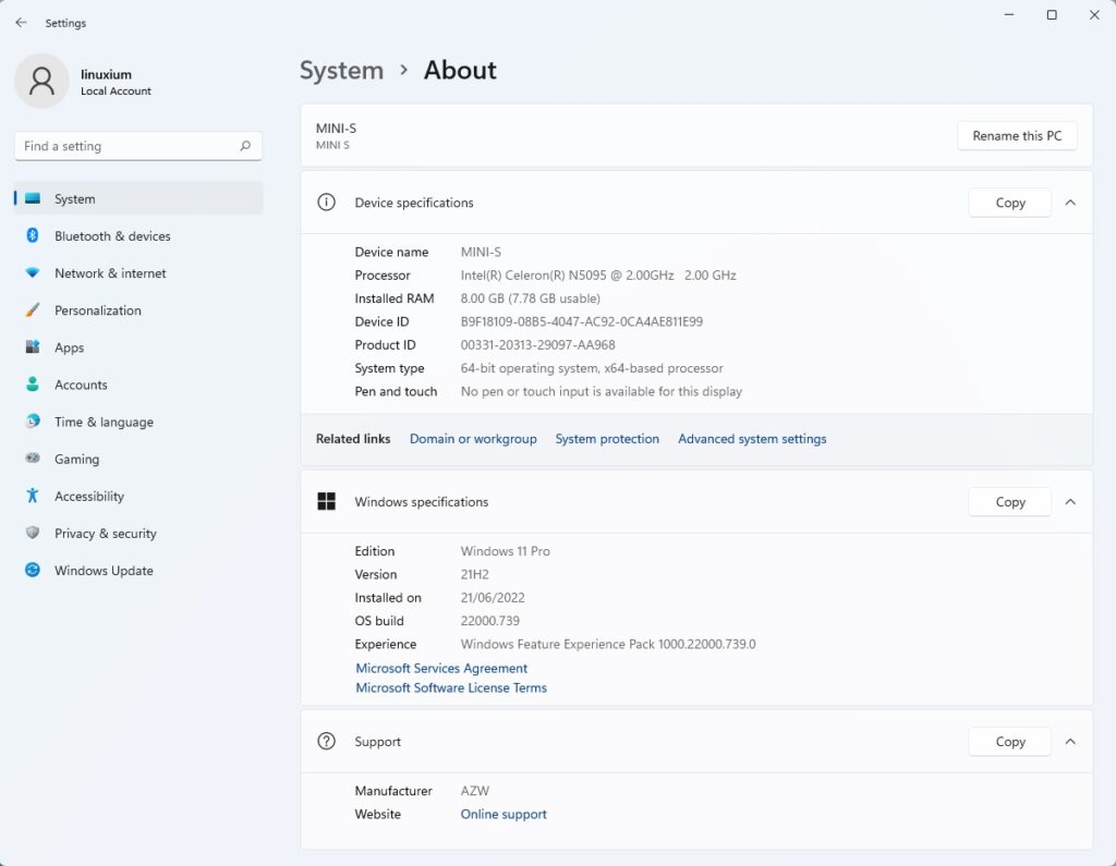 На Beelink MINI S была установлена лицензионная копия Windows 11 Pro версии 21H2, которая после применения обновлений имела сборку 22000.739. Беглый взгляд на информацию об оборудовании показывает, что оно соответствует спецификациям: