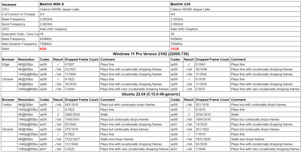 Для тестирования в реальных условиях мы воспроизвели несколько видео в Edge и Chrome в Windows, а также в Firefox и Chrome в Ubuntu. В Edge исходным кодеком для видео является «av01», однако, он обычно изо всех сил пытается воспроизвести видео и переключается на «vp09», тогда как Chrome всегда использовал «vp09». Опять же параллельно мы повторили тесты на U59, чтобы можно было напрямую сравнивать результаты: