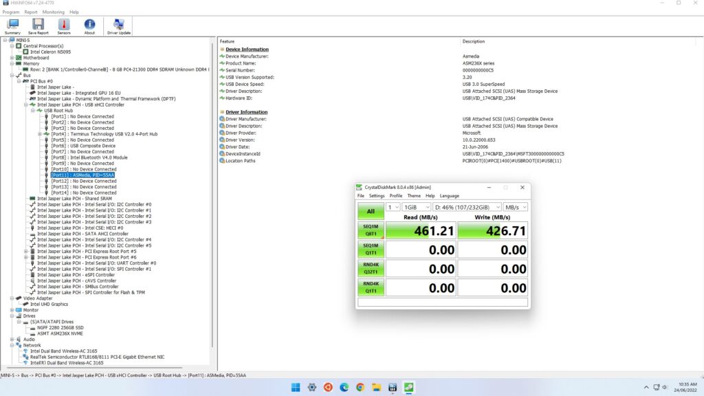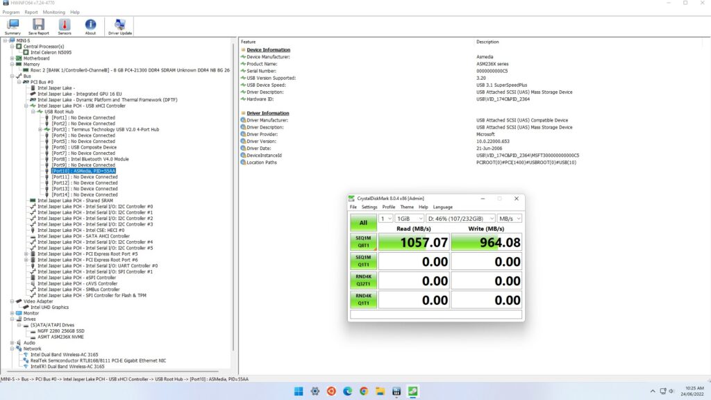 и указаны USB-порты как «USB 3.0», поэтому мы протестировали их вместе, используя Samsung 980 PRO PCle 4.0 NVMe M.2 SSD, размещенный в «адаптере USB-M.2 NVMe» (корпус ORICO M2PAC3-G20 M.2 NVMe SSD), который показал, что два передних USB-порта на самом деле были «USB 3.1» (USB 3.2 Gen 2×1, т.е. 10 Гбит/с):