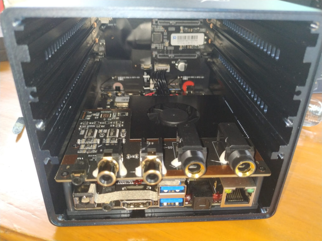 Мы видим аудиоплату с двумя аудиокодеками ESS, вентилятор, покрывающий процессор (и несколько других компонентов), а также, сзади, плату SATA. Также есть кнопка восстановления под портом HDMI.