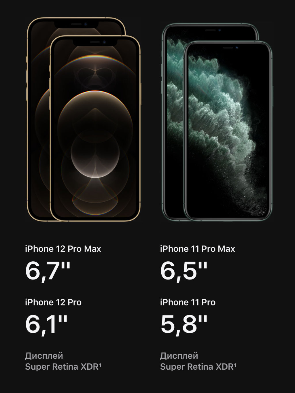 - Дисплей: iPhone 11 Pro и Pro Max – 5.8’’ и 6.5’’, iPhone 12 Pro и Pro Max – 6.1’’ и 6.7’’;