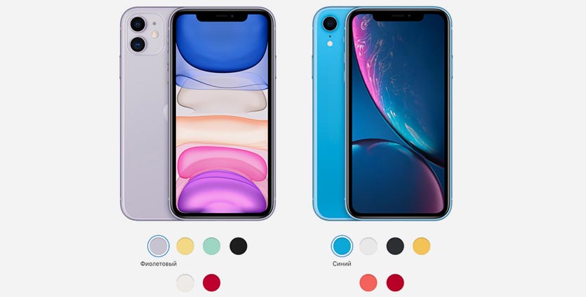 Отличить iPhone 11 от iPhone XR можно по двойной камере и новым цветам корпуса. Вместо кораллового, ярко-жёлтого и голубого цветов появились сиреневый, бледно-жёлтый и мятно-зелёный. Неизменными остались чёрный, белый и красный.