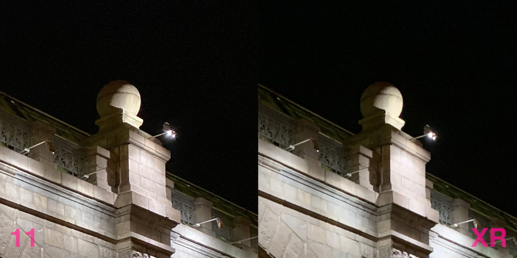 Разумеется, iPhone XR всего этого не умеет. Однако 100-процентные кропы показывают, что при ночном режиме теряется детализация — детали на снимке с XR выглядят чуть лучше. Однако на общее впечатление от снимка детализация, повторюсь, практически не влияет.
