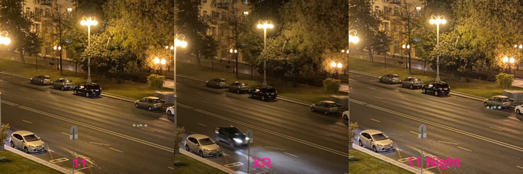Зато в тёмное время суток iPhone 11 может предложить новую опцию — ночной режим. Благодаря оптической стабилизации можно снимать с относительно длинной выдержкой. Её можно вручную регулировать в небольших пределах от 1 до 3 секунд.