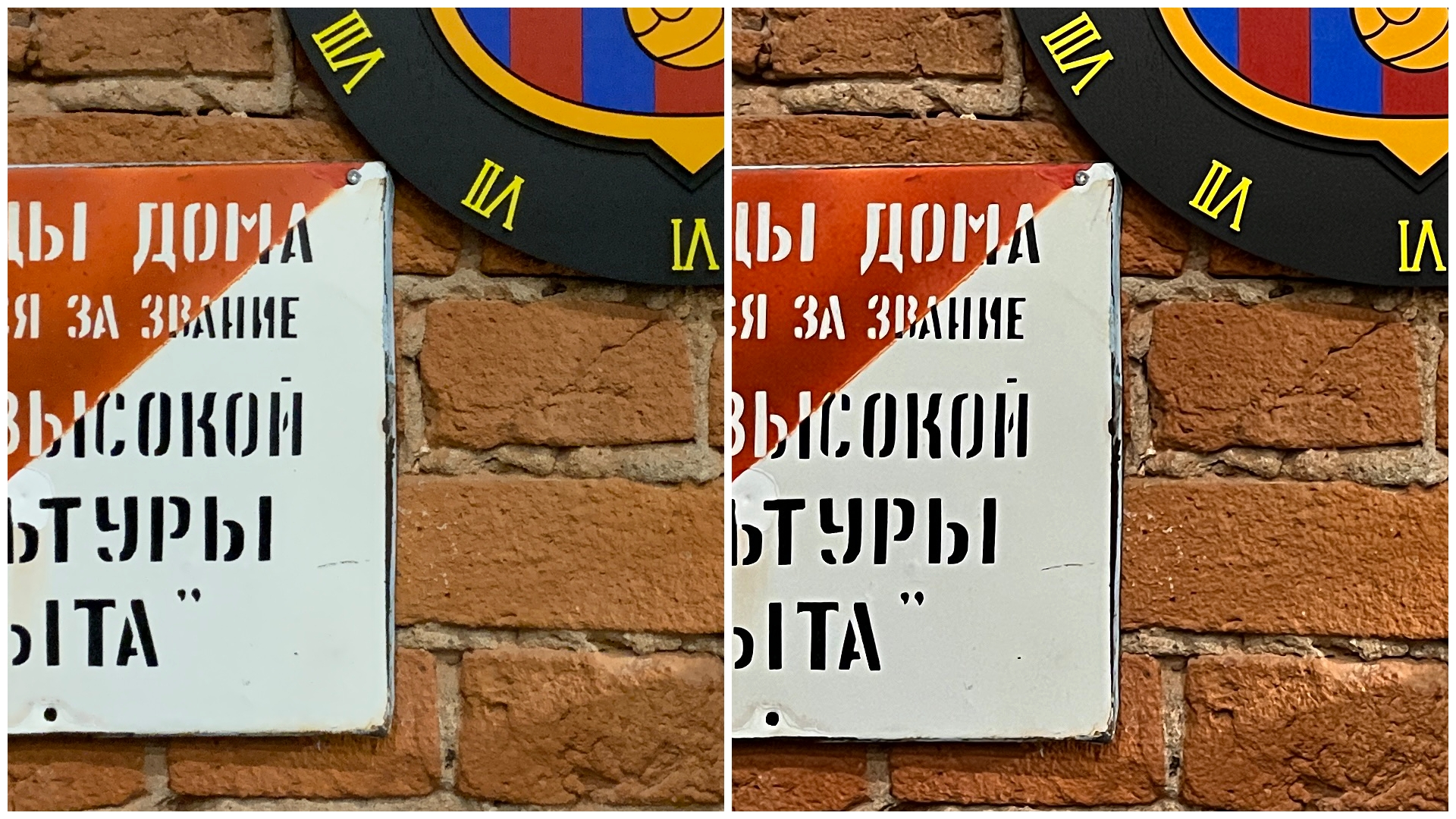 Время увеличить и удивиться. В первую очередь непонятно, почему iOS 15 не смогла удалить пресловутые блики на iPhone 13 — обещали же софтовое исправление. В остальном новичок крут: снимок значительно чётче, можно прочитать название аптеки слева на зелёном фоне, а на XR всё растекается в однородную массу. Видно текстуру асфальта, структуру стен, хорошо различимы символы на знаках.