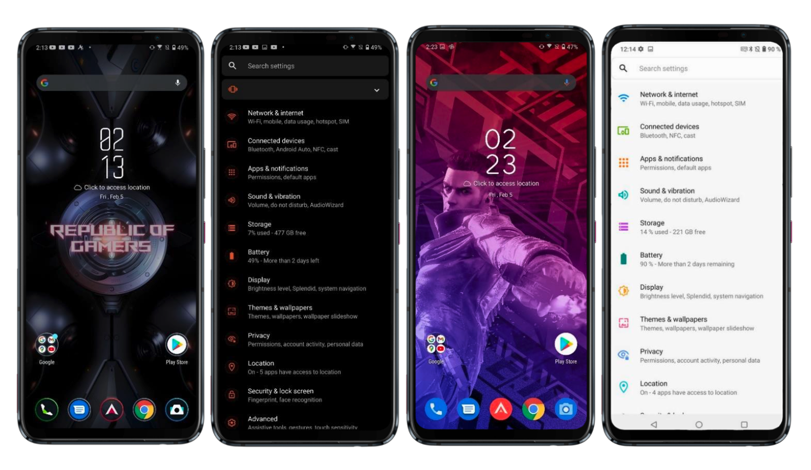 По своей структуре и возможностям они не отличаются, и практически полностью повторяют стандартный интерфейс Android 11, но с дополнительными опциями. Вся разница заключается в дизайне, у ROG UI по умолчанию тёмный интерфейс и другой набор иконок, другой набор стилей Always on Display, а также анимация сканера отпечатков пальцев. Кроме этого, есть предустановленные игровые темы оформления, которые включают изменение экрана блокировки, обоев, иконок, экрана входящего вызова и стиля Always onDisplay.