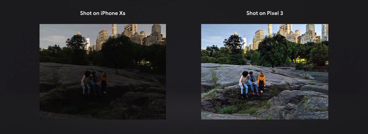 Во время презентации показали сравнение кадров, сделанных на iPhone Xs Max и Pixel 3, у последнего был активирован Night Sight. Все круто, но выглядит неестественно и телефон в этом режиме нужно держать чуть ли не на штативе.