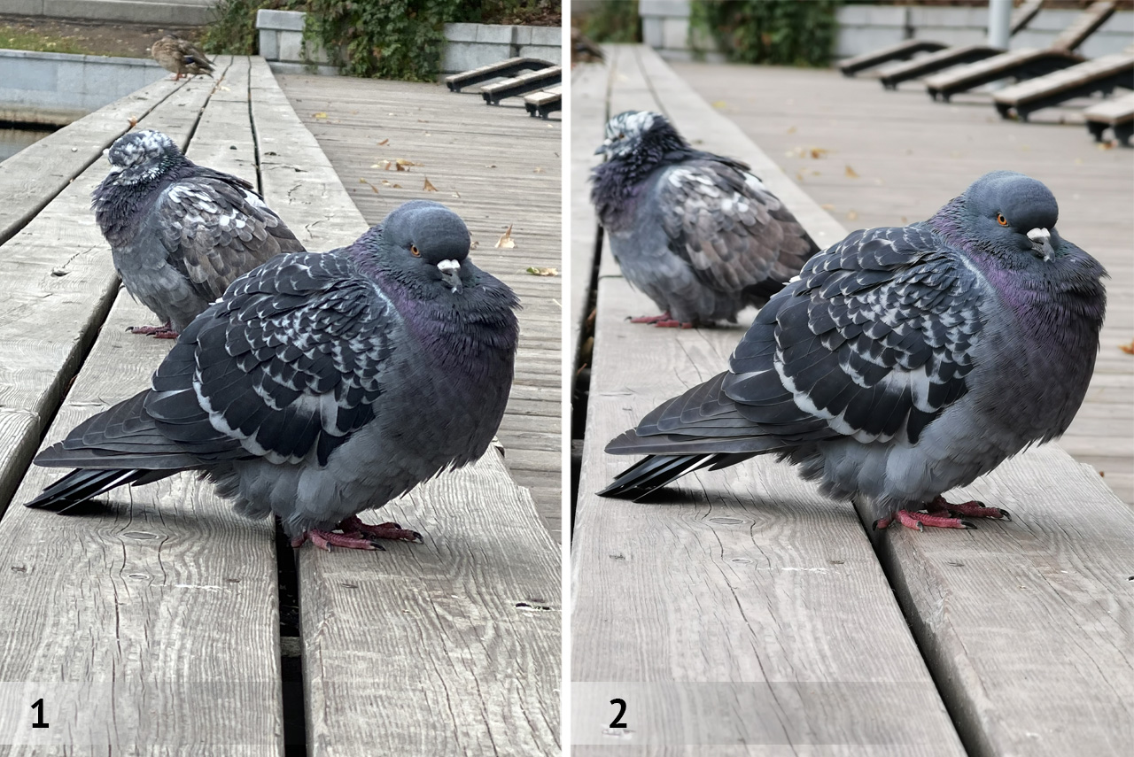 Предлагаю вам самим угадать следующую пару фотографий, какой голубь сфотографирован на iPhone 11 Pro, а какой – на Huawei P30 Pro. Выбирайте сердцем!