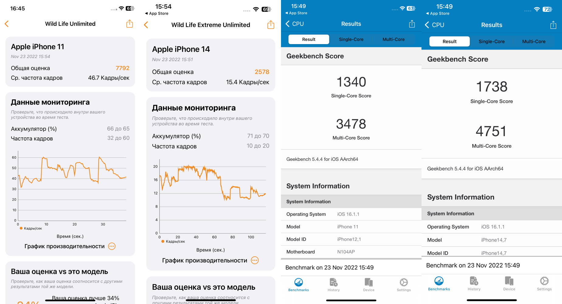 Оценивать смартфоны по бенчмаркам в данном случае занятие не самое логичное — и так понятно, что iPhone 14 победит старое устройство. Но для проформы вот сравнение производительности в Geekbench 5, разница в пользу новинки около 30-40 %.