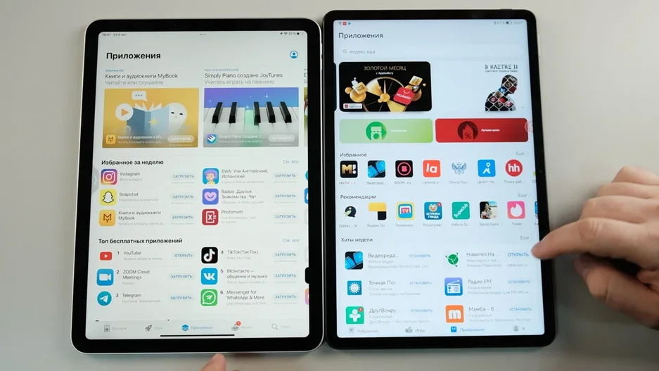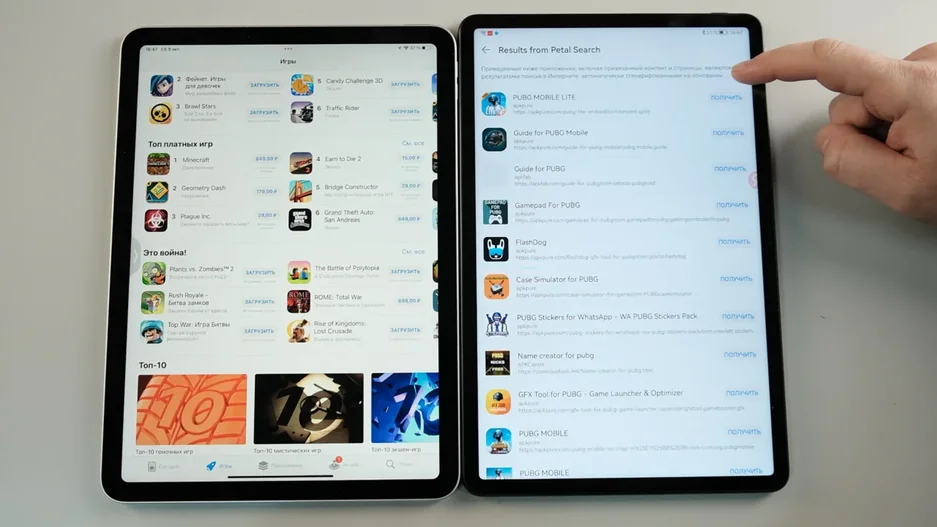 Системы работают с собственными магазинами приложений. У iPad это Appstore, а у Huawei AppGallery. И на Huawei по-прежнему нет поддержки Google сервисов. Хотя это и можно обойти встроенными в систему инструментами, а именно сервисом Petal Search, который подкидывает прямо в поиске по AppGallery ссылки на APK нужных приложений.