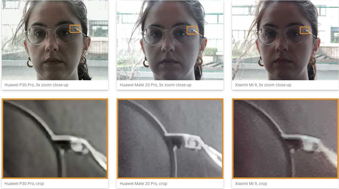 Huawei P30 Pro, Huawei Mate 20 Pro, Xiaomi Mi 9, сравнение уровня детализации при пятикратном приближении