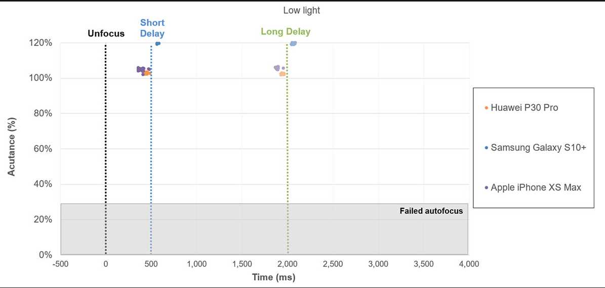 Система автофокусировки PDAF в P30 Pro поддерживается лазером ToF, который может измерять расстояние до объекта в любых условиях освещения. В результате автофокусировка Huawei AF быстро фокусируется и дает неизменно четкие изображения при любых условиях освещения. На приведенном ниже сравнительном графике видно, что автофокусировка P30 Pro находится на том же высоком уровне, что и другие флагманские смартфоны, такие как Samsung Galaxy S10 + и iPhone XS Max. Благодаря нулевой задержке затвора и технологии буферизации, камера способна захватывать изображение практически одновременно с нажатием затвора, как для коротких, так и для длительных задержек после расфокусировки