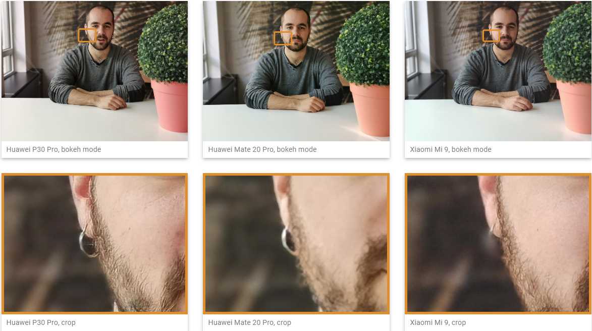 Режим боке в P30 Pro также хорошо размывает объекты на переднем плане, например, растение на столе в примере ниже. В этом сравнении новый смартфон обеспечивает наилучшую детализацию лица и лучше всего справляется с такими сложными элементами сцены, как серьга в ухе.