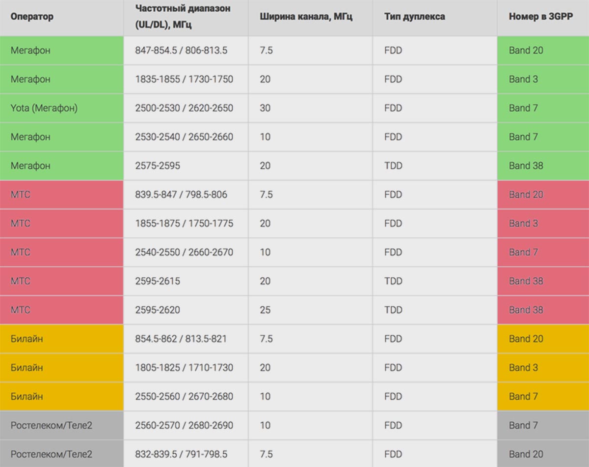 Сейчас смартфоны для всех регионов поддерживают используемые в РФ LTE Band 3, Band 7, Band 20 и Band 38.