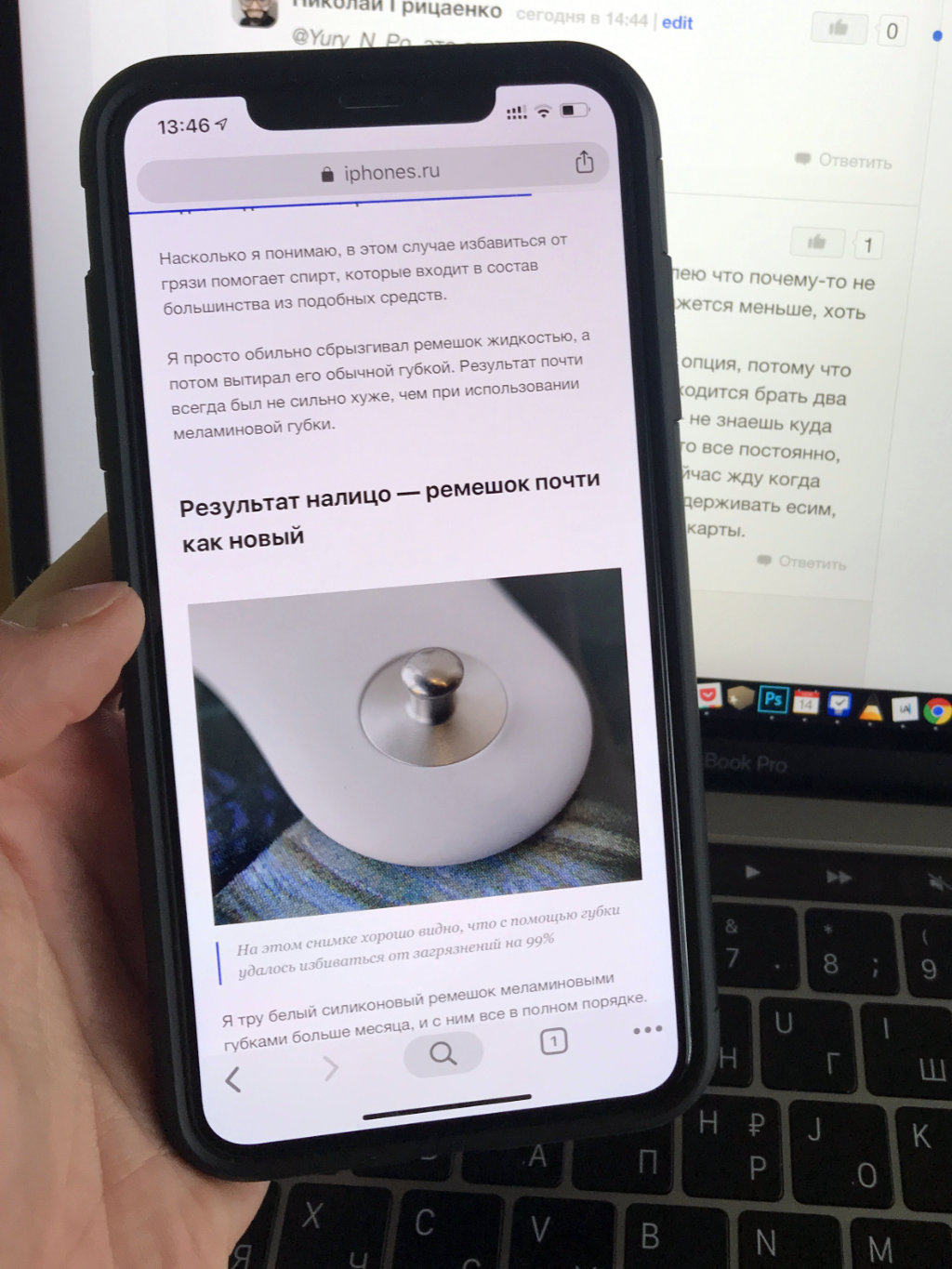 Здесь хорошо видно, как OLED на iPhone уходит в розовый в сравнении с IPS на MacBook