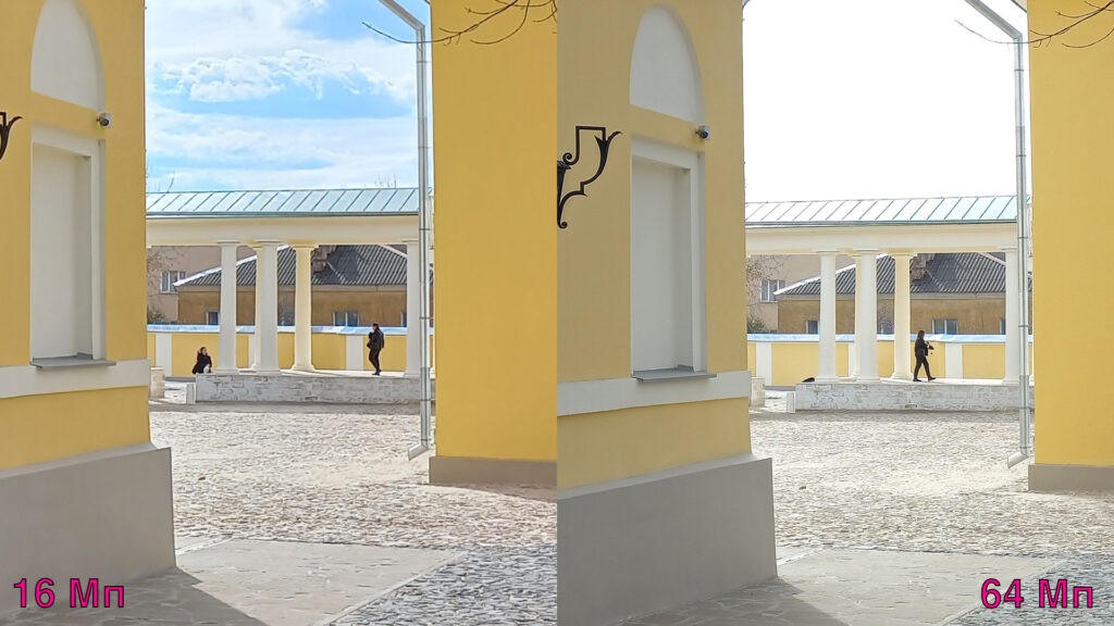 Понятное дело, что мы не говорим о флагманском качестве фото и видео. Просто в старшей «галактике» в качестве основного сенсора используется тот же модуль на 64 Мп, что и в A32. По умолчанию смартфон стреляет в разрешении 16 Мп. В режиме 64 Мп детализация выше, но вы рискуете потерять небо (HDR), нюансы в тенях и остальные улучшалки изображения.
