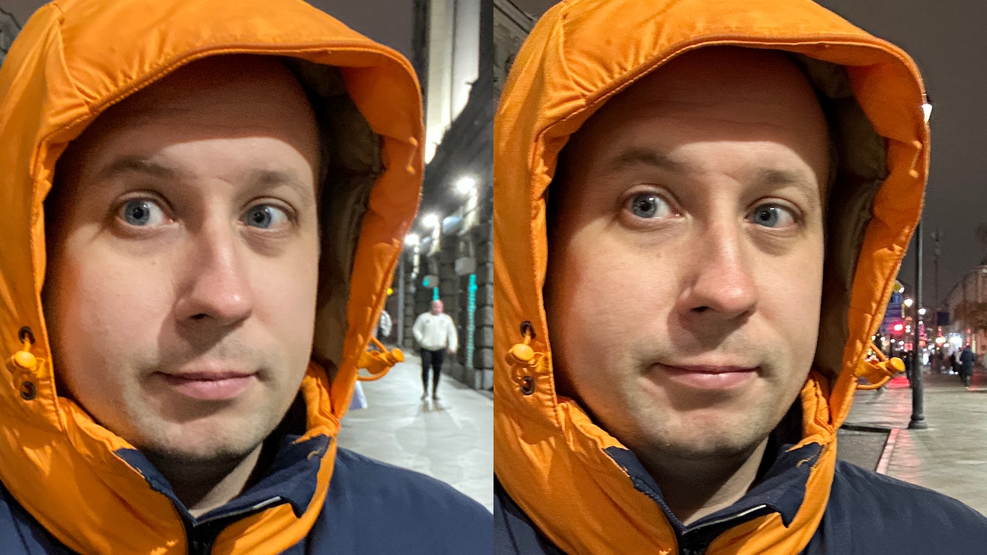 На этом кадре, где много белых предметов, уже не так отчётливо заметна разница между цветами. iPhone 11 тоже справился хорошо, но на iPhone 14 белый всё же немного ближе к истине. Плюс заметно, как лучше проработана текстура шарфа.