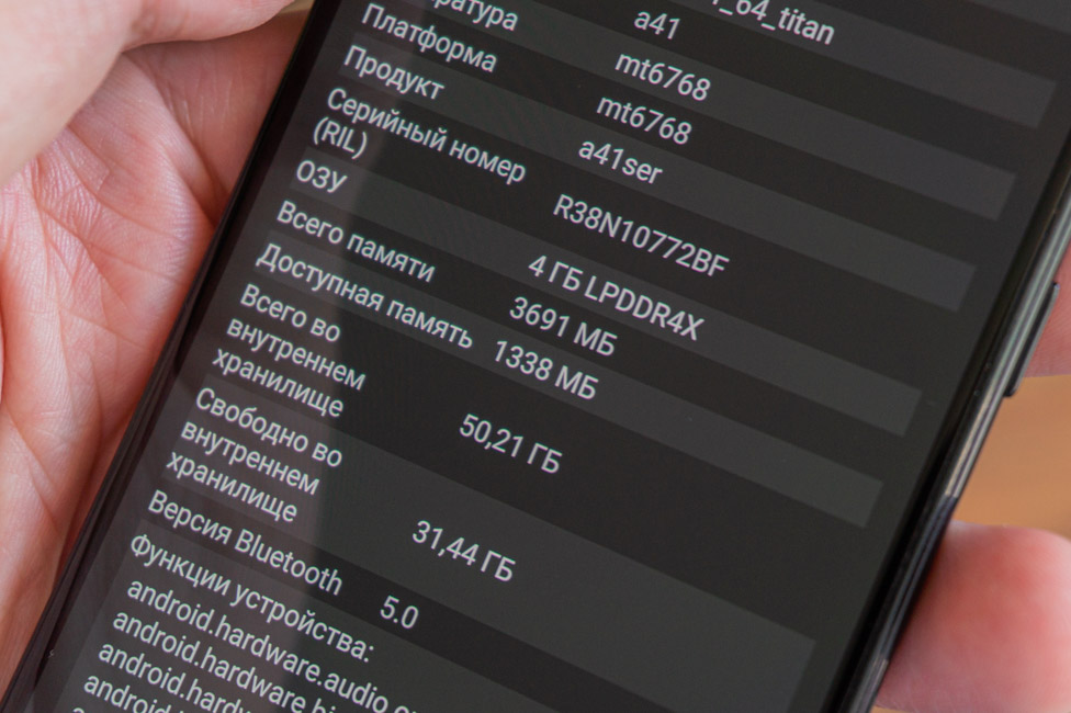 Из 64 ГБ для пользователя будут доступны 50,20 ГБ. В любом случае при необходимости можно поставить карту памяти формата microSD объемом до 512 ГБ. Напомню, что становится она в отдельный слот и не отнимает возможность пользоваться двумя SIM-картами при этом.
