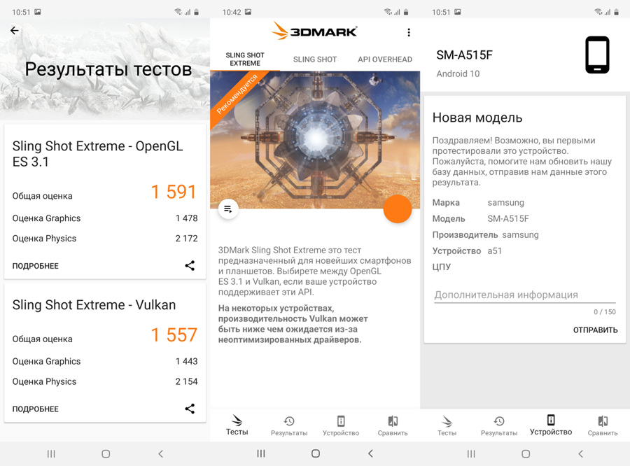 Результаты тестирования производительности Samsung Galaxy A51 в GFX 3.1 и 3DMark: